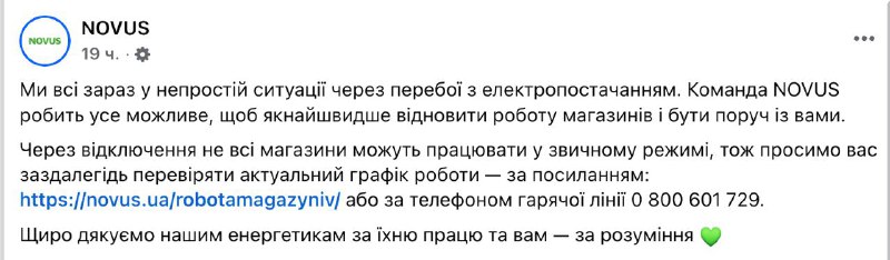 11.31 Торговые сети Novus и "Сильпо" приостанавливают работу некоторых супермаркетов в Киеве из-за длительных отключений света. Количество закрытых магазинов не уточняется.