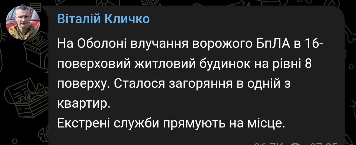 8.17 В Оболонском районе Киева беспилотник влетел в 16-этажный жилой дом на уровне восьмого этажа. Загорелась квартира, сообщил мэр города.