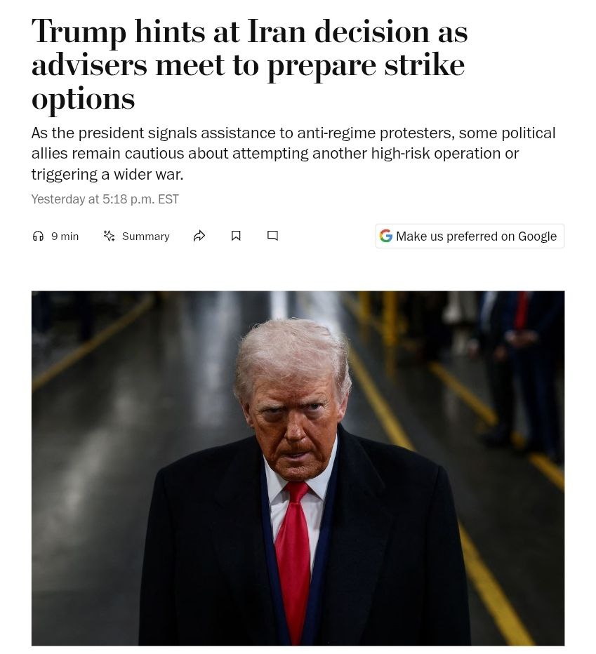 "У нас нет никаких признаков того, что президент Трамп собирается атаковать ядерные объекты. Более вероятно, что он будет преследовать руководство организаций и сил, ответственных за убийства протестующих и причастных к ним", - сказал один из чиновников.