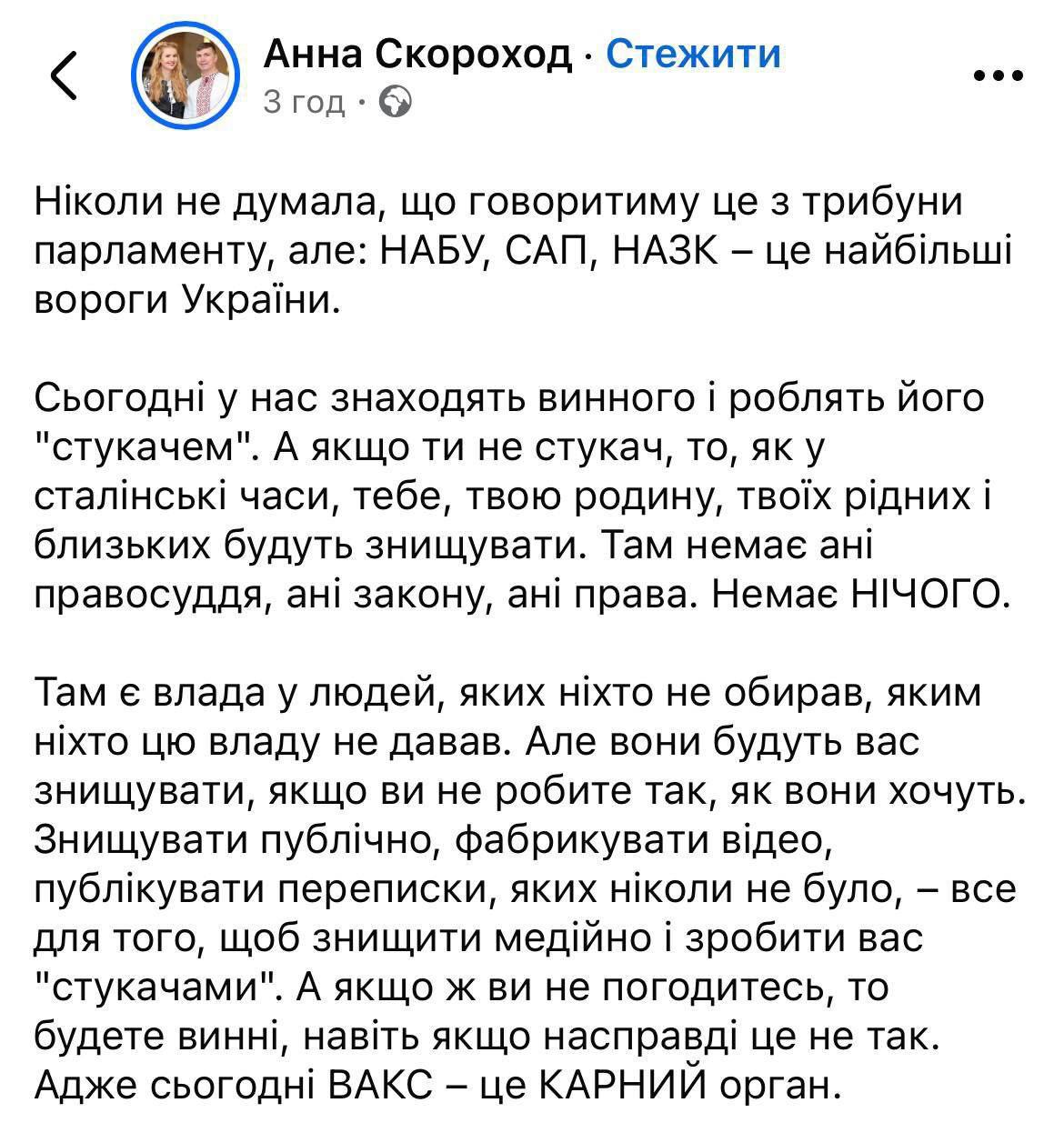 "Сегодня у нас находят виновного и делают его стукачом. А если ты не стукач, то, как в сталинские времена, тебя, твою семью, твоих родных и близких будут уничтожать. Там нет ни правосудия, ни закона, ни права. Там есть власть у людей, которых никто не выбирал, каким никто эту власть не давал. Но они будут вас уничтожать, если вы не поступаете так, как они хотят. Уничтожать публично, фабриковать видео, публиковать переписки, которых никогда не было, – все для того, чтобы уничтожить медийно и сделать вас стукачами. А если вы не согласитесь, то будете должны, даже если на самом деле это не так. Ведь сегодня ВАКС – это карательный орган", - заявила Скороход.