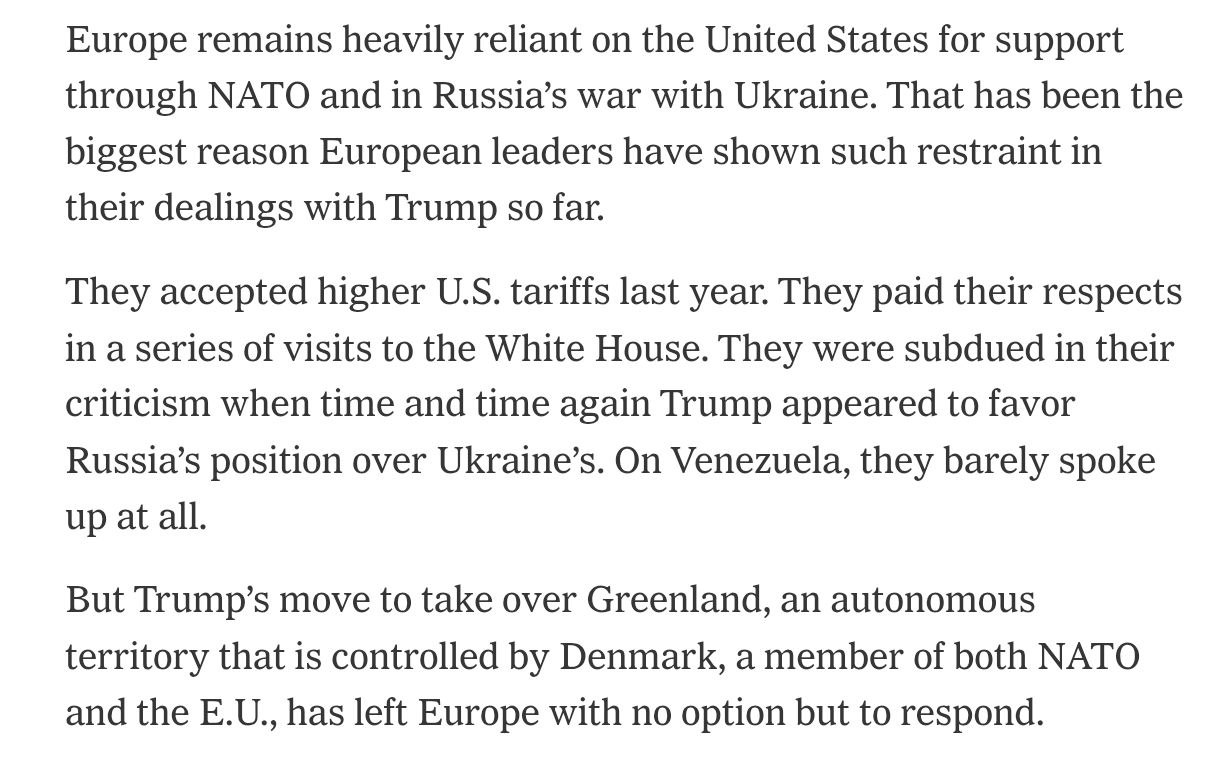 Ситуация изменилась после решения Трампа взять под контроль Гренландию. Этот шаг, по оценке газеты, не оставил Европе возможности и дальше избегать ответа.