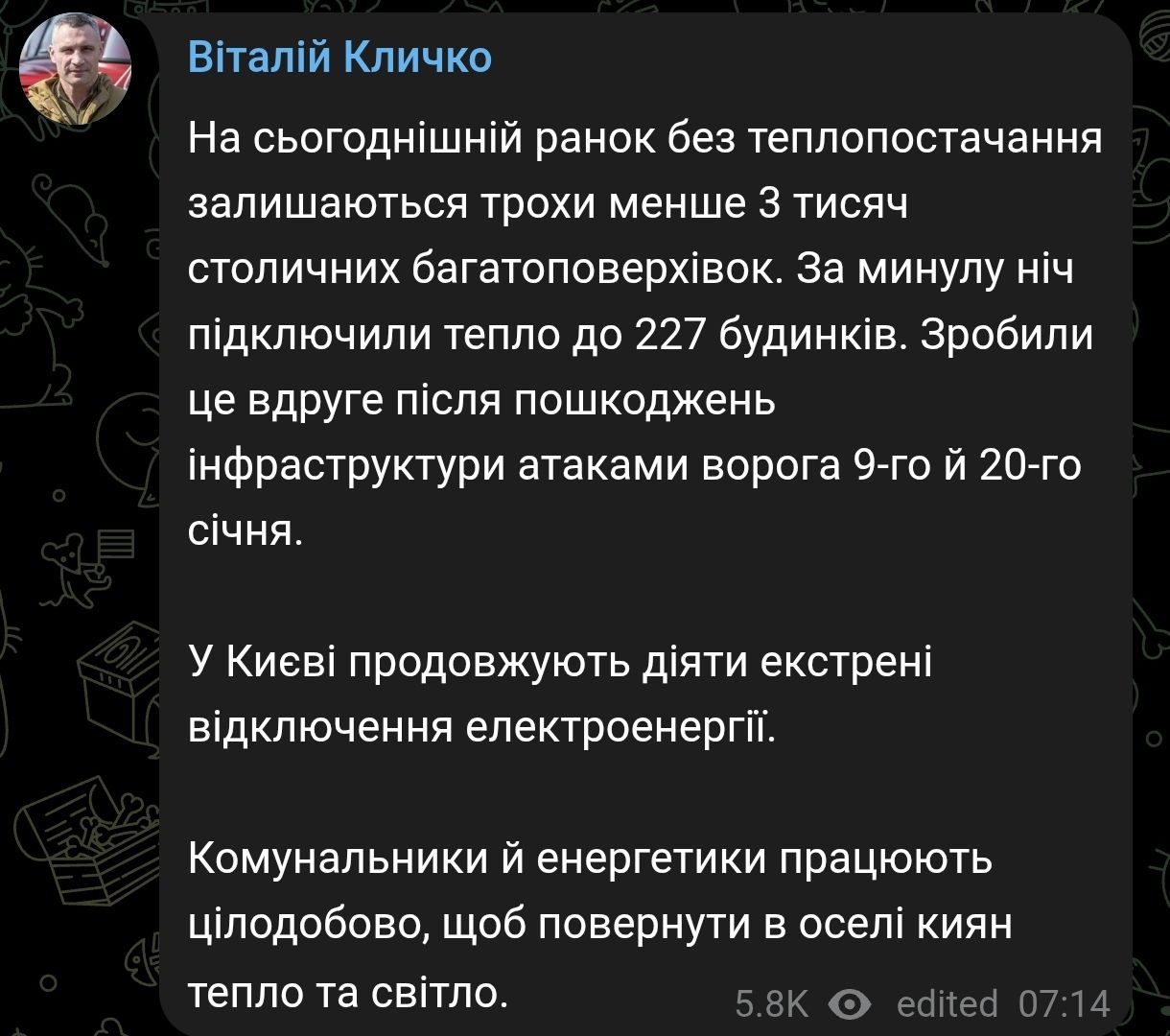 08:21 В Киеве без отопления остается около трех тысяч многоквартирных домов, сообщил Кличко. По его словам, за прошедшую ночь подачу отопления восстановили в 270 домах.