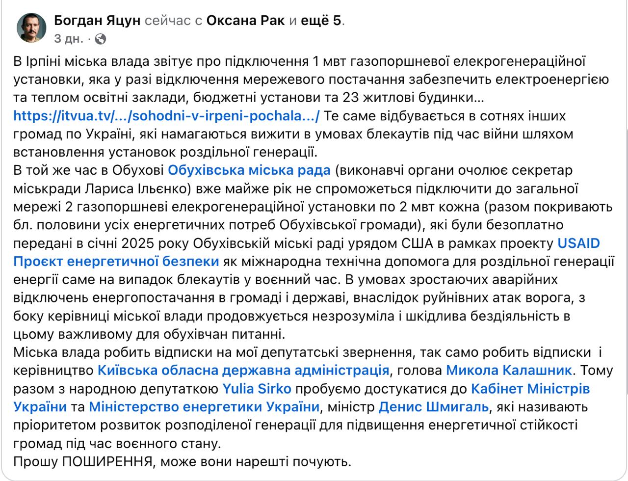 "Проектно-сметная документация находится на согласовании в ДТЭК, что привело к отсрочке работ по подключению установок. И хотя законодательством Украины предусмотрен упрощенный порядок подключения такого энергетического оборудования во время военного положения, похоже, городские власти Обухова не планируют проводить эти работы по упрощенному порядку", – заявил депутат.