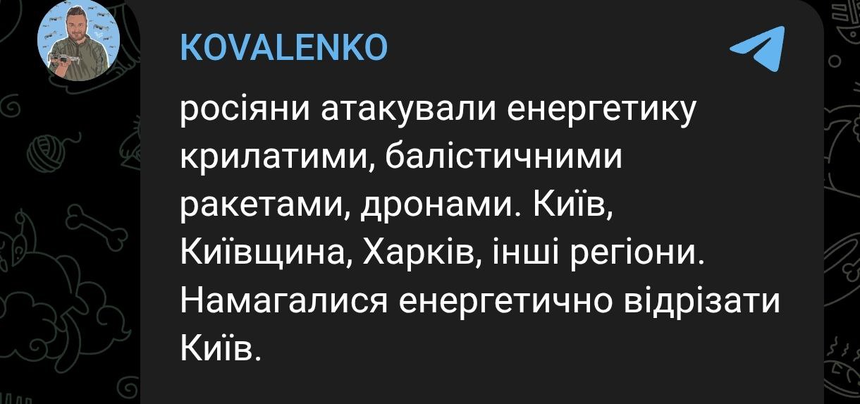 По данным Андрея Коваленко, Киев и область, а также Харьков атаковали дронами, крылатыми и баллистическими ракетами.