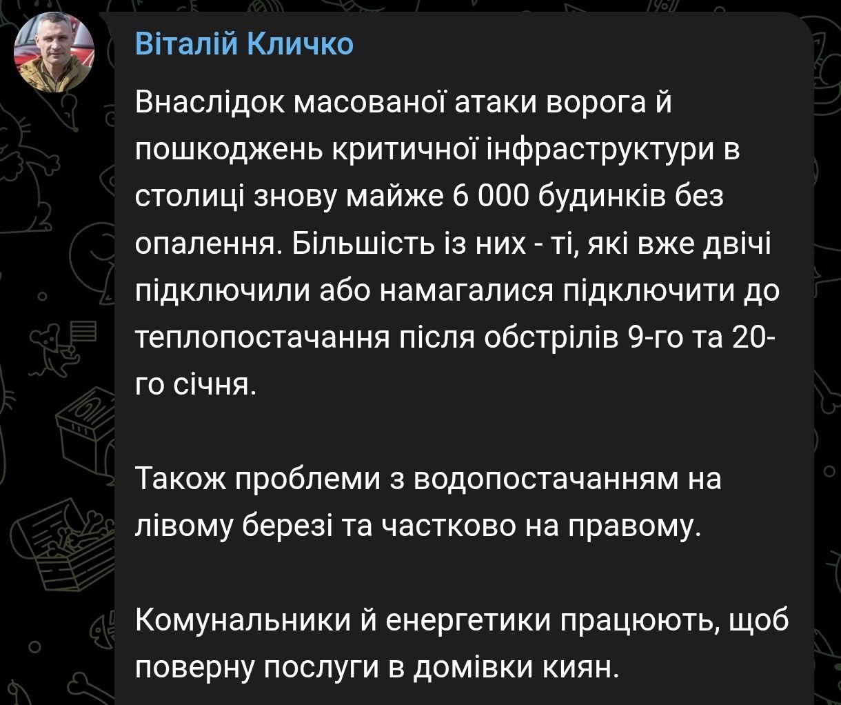 9:16 В Киеве после ночного удара снова около 6.000 домов без отопления, сообщил Кличко.