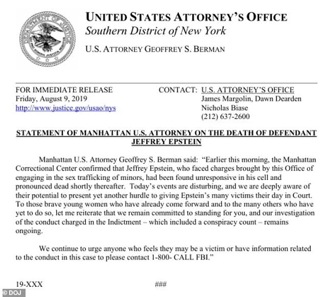 В обнародованных Минюстом США материалах по делу педофила Джеффри Эпштейна оказалось заявление о его смерти от имени правоохранительных органов, которое было написано за день до гибели финансиста в тюрьме.