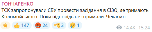 "Информация о возможном покушении на жизнь Коломойского впервые с момента заключения появилась при доставке на заседание ВСК. Адвокаты связывают это заявление СБУ с информацией, которую Коломойский может рассказать следственной комиссии, рассматривая это как возможное давление", - заявил Гончаренко.