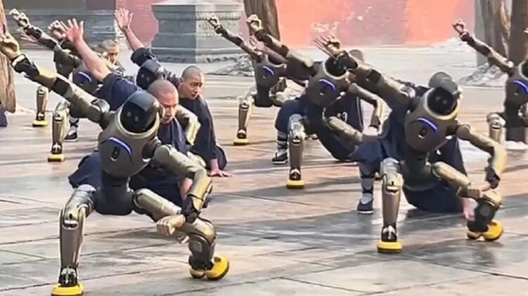 В Шаолиньском монастыре роботов используют для обучения кунг-фу. На видео многочисленные роботы демонстрируют плавные движения, имитирующие удары, а также атакующие стойки в стиле шаолиньского кунг-фу, создавая уникальную сцену боевых искусств в знаменитом древнем храме.