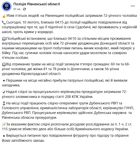 В Ровенской области в общежитии для внутренне перемещенных лиц мужчина убил пятерых соседей во время бытового конфликта.