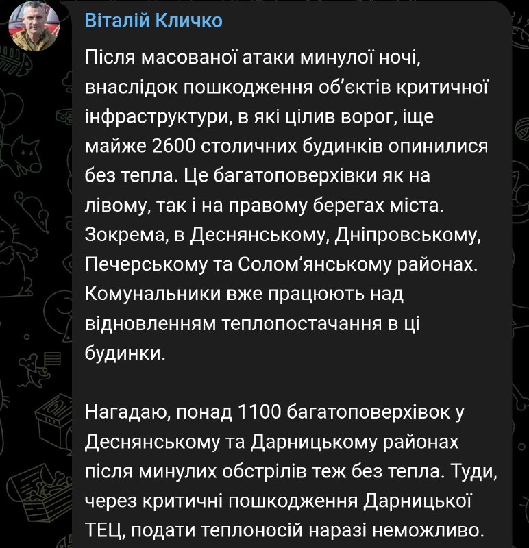 09:00 В Киеве 3700 жилых домов остались без тепла после ночного удара, сообщил Кличко. Из них 2600 домов в Деснянском, Днепровском, Печерском и Соломенском районах.