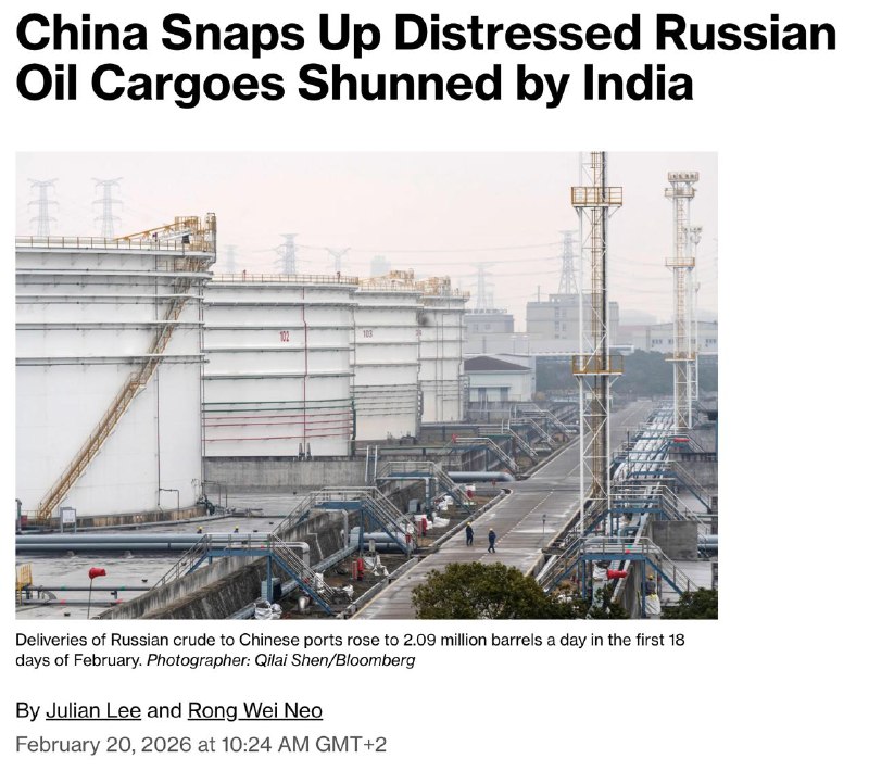 С 1 по 18 февраля поставки российской нефти в порты Китая выросли до 2,09 миллиона баррелей в день. В январе этот показатель находился на уровне 1,72 миллиона баррелей, а в декабре 2025 года - 1,39 миллиона, пишет Bloomberg. Издание отмечает, что это "более чем компенсировало" снижение закупок со стороны Индии.