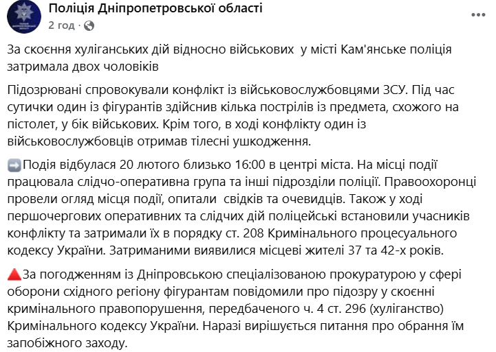 В полиции сообщили, что инцидент произошёл 20 февраля около 16:00 в центре города Каменское. На месте происшествия работала следственно-оперативная группа и другие подразделения полиции. Правоохранители провели осмотр места происшествия, опросили свидетелей и очевидцев.