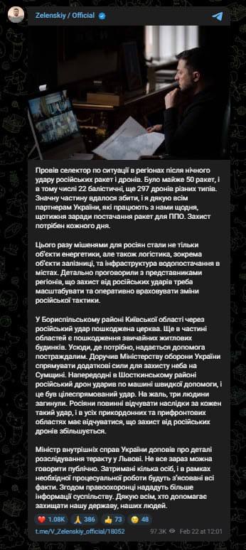 "Было почти 50 ракет, в том числе 22 баллистические, ещё 297 дронов разных типов. Значительную часть удалось сбить", - пишет президент.