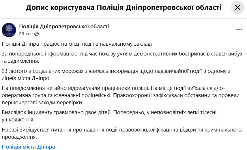 В лицее №137 Днепра произошел взрыв во время демонстрации школьникам боеприпасов, пострадали двое детей.