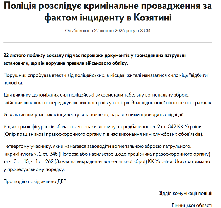 "22 февраля возле вокзала во время проверки документов у гражданина патрульные установили, что он нарушил правила воинского учета. Нарушитель попытался убежать от полицейских, а местные жители пытались силой отбить мужчину. Для вызова вспомогательных сил полицейские использовали табельное огнестрельное оружие, совершив несколько предупредительных выстрелов в воздух. В результате события никто не пострадал", - сообщили в полиции.