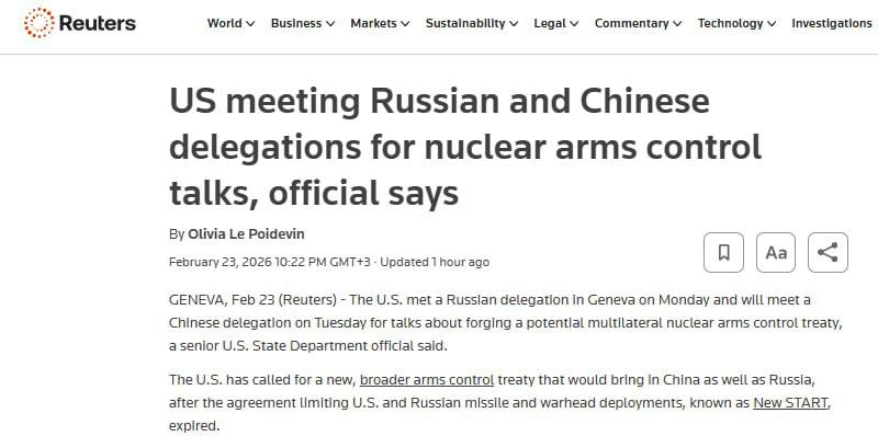Вашингтон, как отмечает Reuters, призывает к заключению нового, более широкого договора о контроле над вооружениями, который включал бы Китай наряду с Россией.