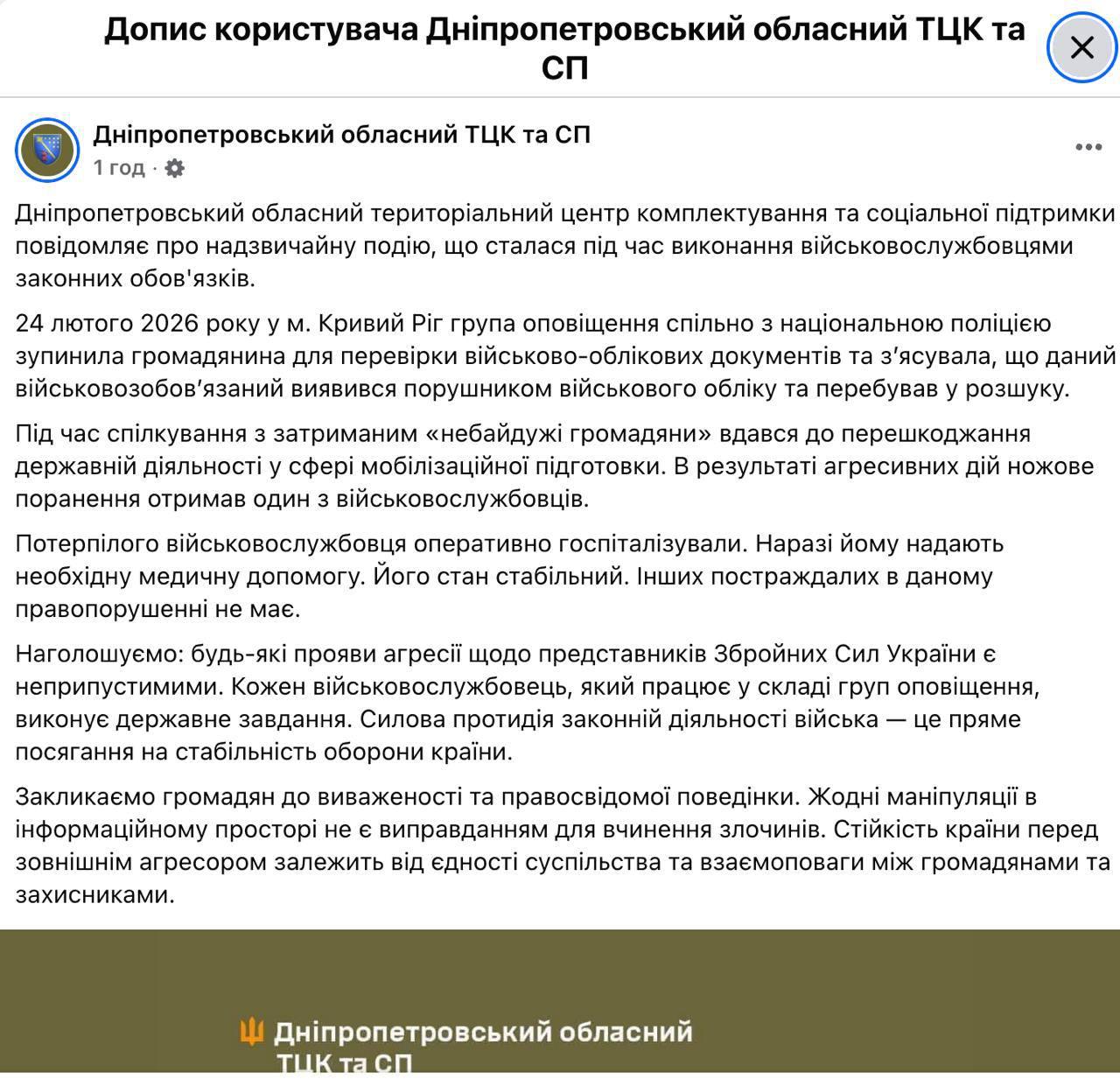 Там говорят, что мужчина был в "розыске ТЦК" и ударил сотрудника ТЦК ножом, а "других пострадавших в данном правонарушения нет".
