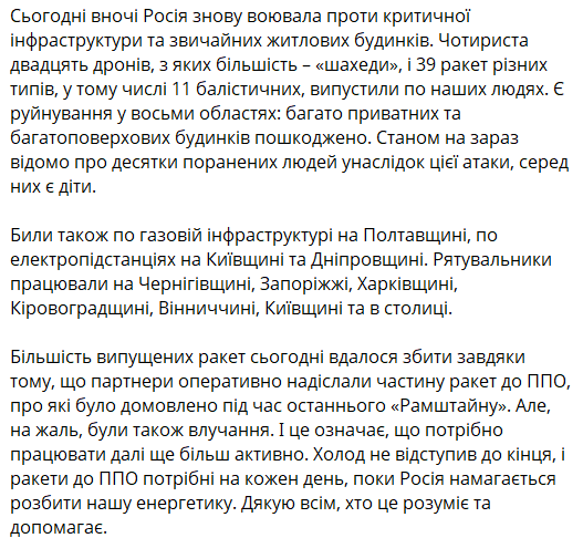 "Сегодня ночью Россия снова воевала против критической инфраструктуры и обычных жилых домов. Четыреста двадцать дронов, большинство из которых - "Шахеды", и 39 ракет разных типов, в том числе 11 баллистических, выпустили по нашим людям", - написал Зеленский.
