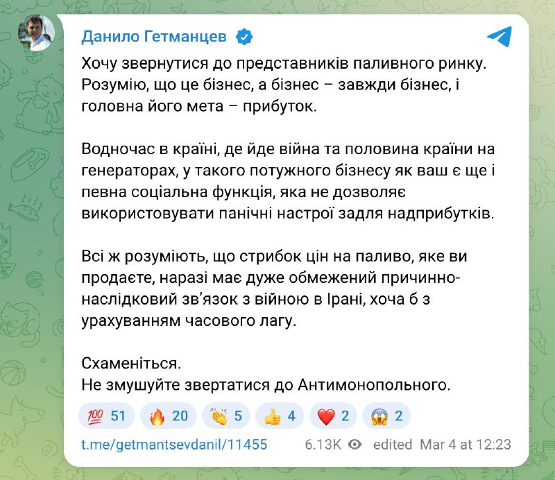"Хочу обратиться к представителям топливного рынка. Все же понимают, что скачок цен на продающееся топливо сейчас имеет очень ограниченную причинно-следственную связь с войной в Иране, хотя бы с учетом временного лага. Опомнитесь. Не заставляйте обращаться в Антимонополь", - написал Гетманцев в своем телеграм-канале, имея в виду, что в мире растут цены на фьючерсы - то есть будущие закупки топлива, а не на уже купленное.