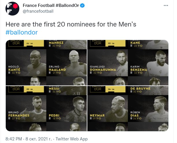 Стали известны имена претендентов на получение награды "Золотой мяч" (ежегодная футбольная награда) по итогам 2021 года, которую вручает авторитетное издание "France Football".