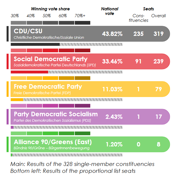 2 грудня 1990-го – вперше з 30-х років – відбулися парламентські вибори в єдиній німецькій державі. Християнські демократи Коля перемогли на них, але аж ніяк не нищівно, як боялися соціал-демократи: ХДС набрала 36,7% (плюс 7,1% союзного баварського ХСС), СДПН – 33,5%. Більше того, всі три партії втратили від 2,3 до 3,5% - але через те, що свою частку відхопили політсили екс-НДР - Партія демократичного соціалізму (колишня СЄПН) та "Альянс-90" (невдовзі влилася до Партії зелених).