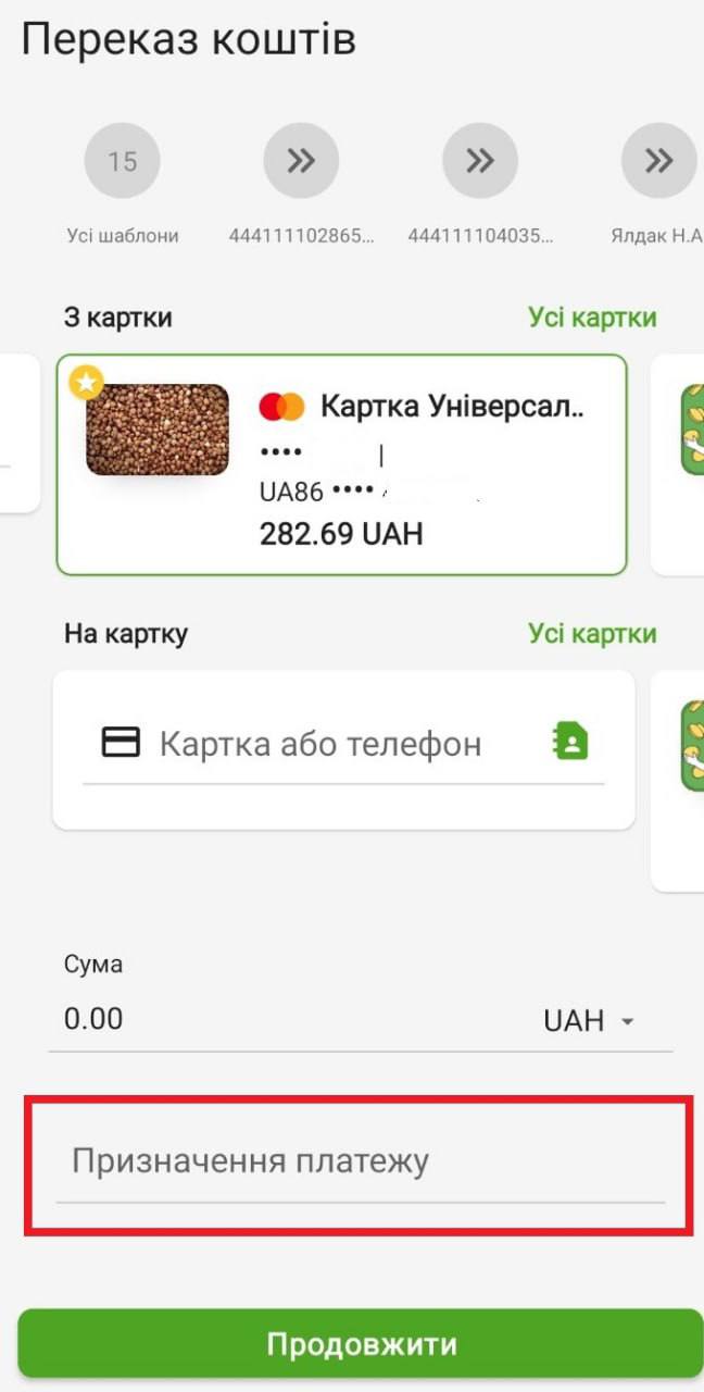 Призначення платежу — це поле, яке з'являється під час кожного Р2Р-переказу чи перерахування по IBAN, воно розміщене під сумою перерахування. Найчастіше поле так і називається: "Призначення платежу", як у "Приватбанку". Але іноді воно може мати іншу назву, наприклад, у monobank це "Коментар". Його банк пропонує клієнту заповнити самостійно залежно від мети платежу.