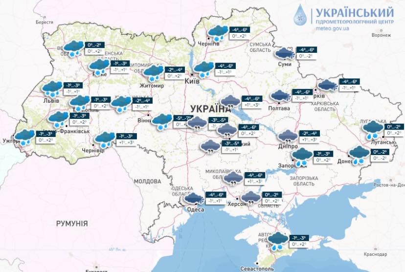 Температура вдень від -2 до +3. У Карпатах упродовж доби -5...-10.