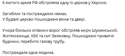 6 лютого армія РФ обстріляла одну із церков у Херсоні. Загиблих та постраждалих немає. У будівлі пошкоджені вікна та двері.