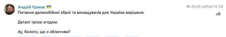Глава Офісу президента Андрій Єрмак переписав свій допис про постачання Україні далекобійної зброї та винищувачів.