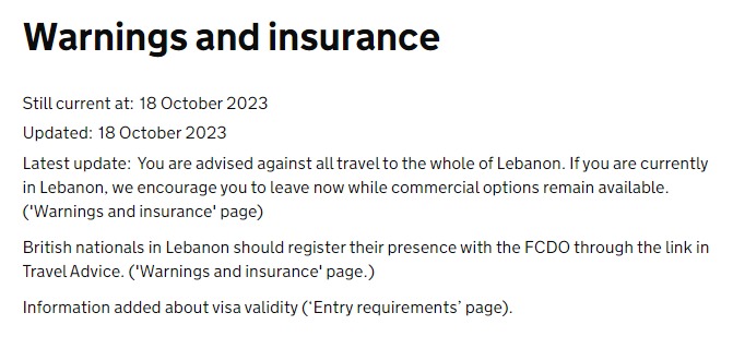 МЗС Великобританії радить утриматися від будь-яких поїздок до Лівану через ризики, пов'язані з конфліктом між Ізраїлем та ХАМАС.