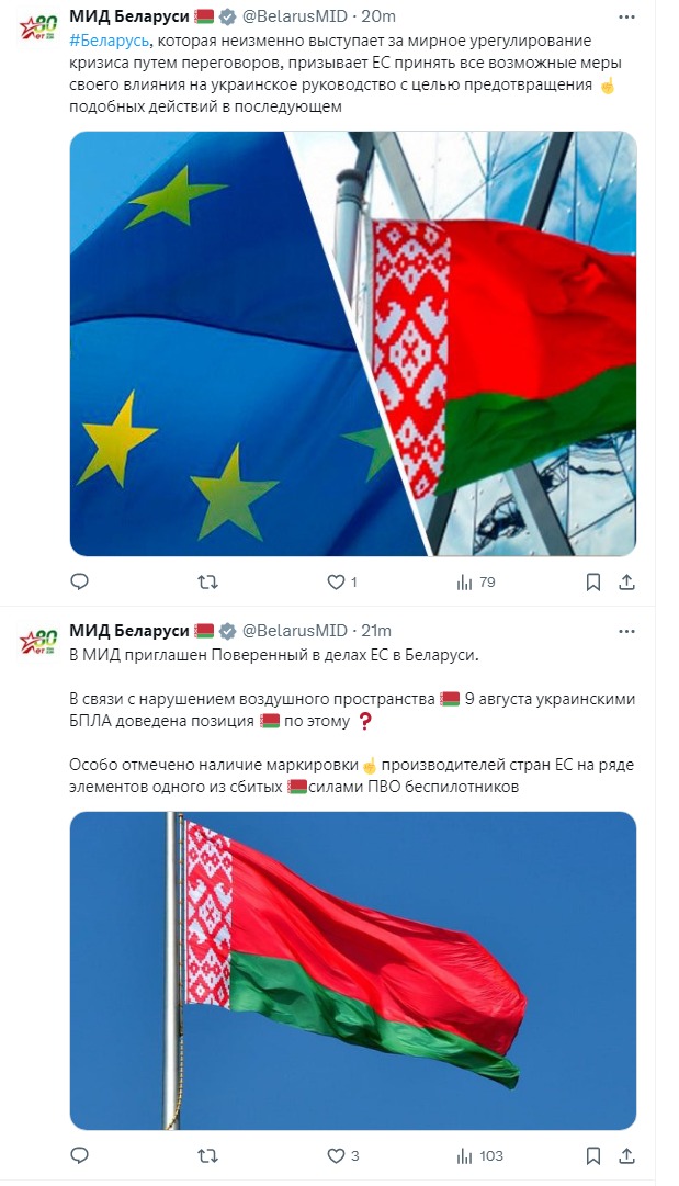 "У МЗС запрошено повіреного у справах ЄС у Білорусі. У зв'язку з порушенням повітряного простору 9 серпня українськими БПЛА доведено позицію Білорусі з цього питання. Особливо зазначено наявність маркування виробників країн ЄС на ряді елементів одного із збитих силами ППО безпілотників. Білорусь, яка незмінно виступає за мирне врегулювання кризи шляхом переговорів закликає ЄС вжити всіх можливих заходів свого впливу на українське керівництво з метою запобігання подібним діям у подальшому", - сказано в публікації.
