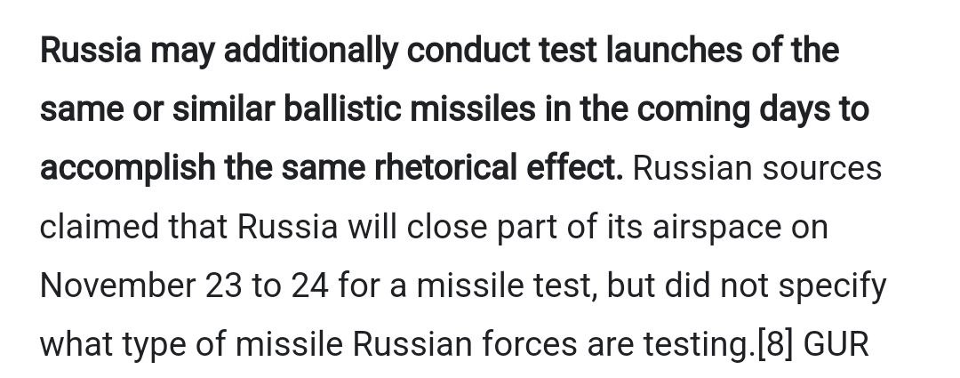 "Росія може додатково провести випробувальні пуски тих самих або подібних балістичних ракет найближчими днями, щоб досягти того ж риторичного ефекту. Російські джерела заявили, що Росія закриє частину свого повітряного простору 23-24 листопада для випробування ракети, але не уточнили, який тип ракети відчувають російські сили", - йдеться у звіті ISW.