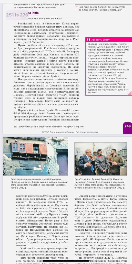 Загалом на сторінках нового підручника близько 10 фотографій Зеленського із різних заходів та подій. Зеленський з екс-прем'єром Великобританії Борисом Джонсоном у Бородянці у 2022 році, Зеленський вручає нагороди військовим, які звільнили Херсон, Зеленський у Бучі, Зеленський з президентом Єврокомісії Урсулою фон дер Ляйєн відкривають табличку на честь європейського політика у Києві, Зелений