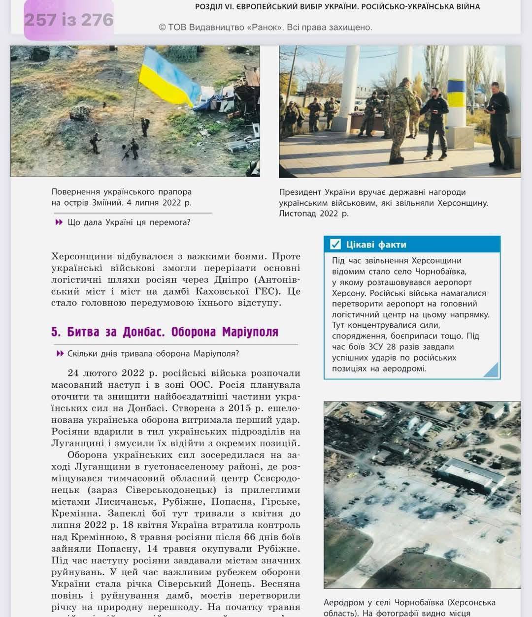 Також у цьому розділі є фотографії екс-міністра оборони Олексія Резнікова на засіданні у форматі "Рамштайн", і екс-головнокомандувача ЗСУ Валерія Залужного (його згадують на сторінках підручника лише один раз) та головнокомандувача Олександра Сирського. Також у посібнику згадується невдалий наступ ЗСУ у 2023 році.