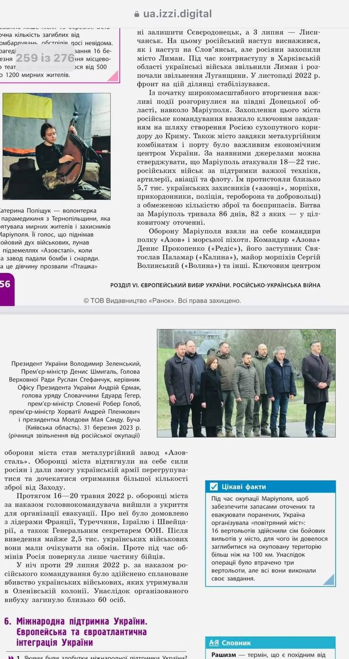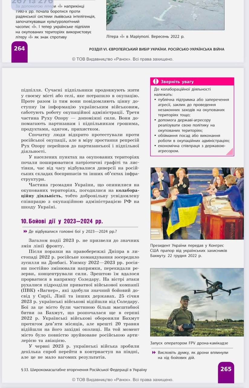 Наприкінці цього розділу (в ньому описані події до 2024 року) школярам пропонують обговорити, що заважає Україні стати членом ЄС та НАТО.