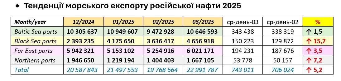 "У березні 2025 року зниження змінилося зростанням, по всіх морях на 5,2% в цілому... Це означає, що санкції проти танкерів не спрацювали. Обсяги експорту говорять самі за себе. Тобто, величезний обсяг санкціонованих танкерів (близько 400) не призвів до дефіциту суден на ринку перевезень з РФ", - каже він.