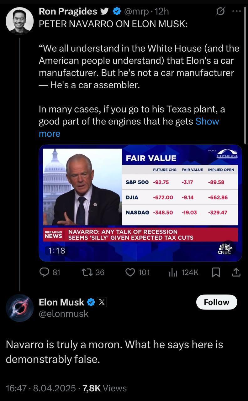 "Наварро справді ідіот. Те, що він тут говорить, є явно хибним. Він тупий як пробка", - заявив Маск.