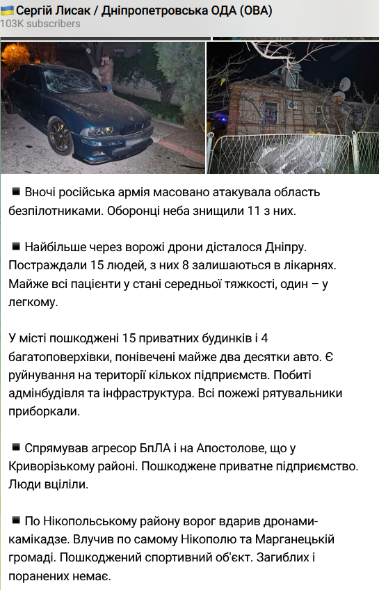 Крім того, під удар дронів потрапив Дніпро. Від ударів БПЛА постраждали кілька підприємств та об'єкти інфраструктури.