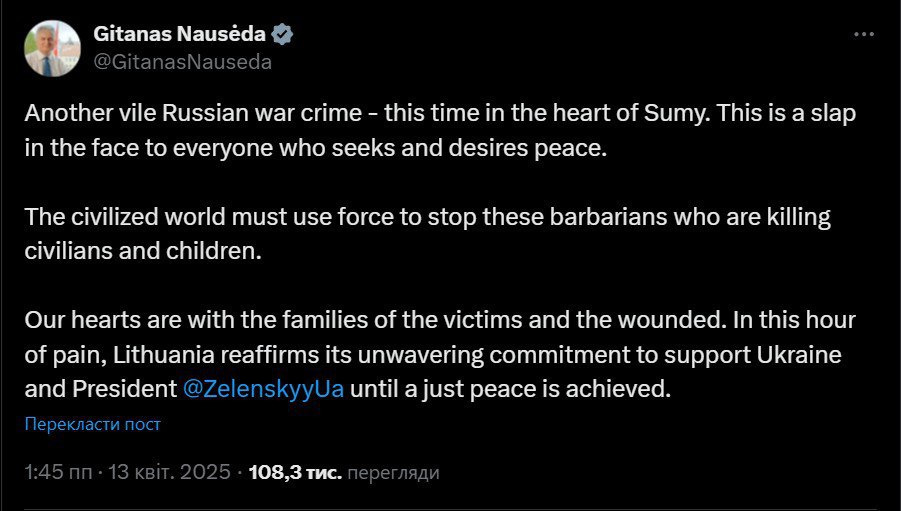 Інші світові лідери також відреагували на обстріл міста Суми. Співчуття висловили президенти Литви Гітанас Науседа та Молдови Майя Санду, а також глава МЗС Естонії Маргус Тсахкна.
