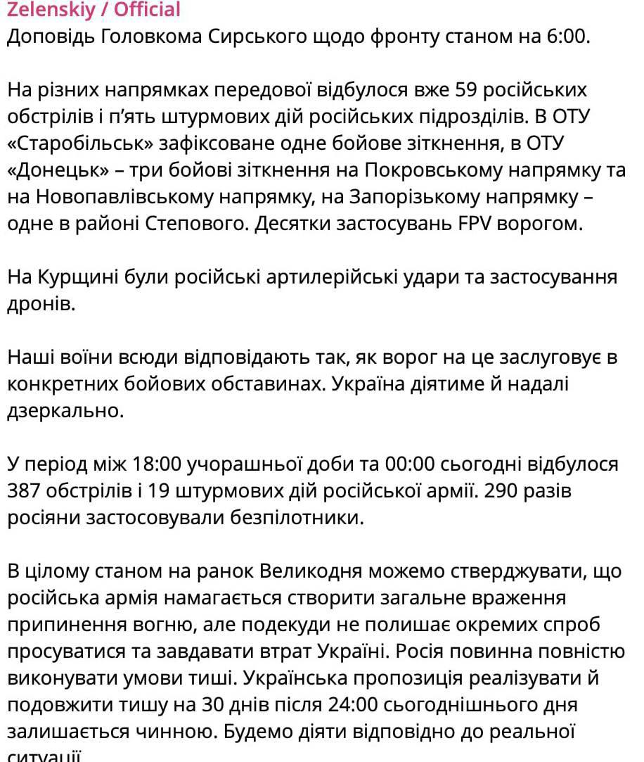 07:34 Президент Володимир Зеленський сьогодні вранці знову заявив, що РФ порушує пасхальне перемир'я.