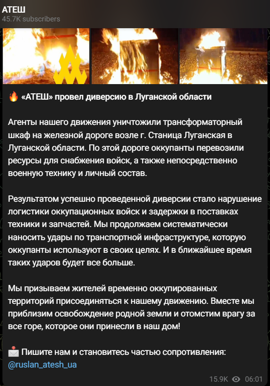 "Результатом успішно проведеної диверсії стало порушення логістики окупаційних військ та затримки у постачаннях техніки та запчастин. Ми продовжуємо систематично завдавати ударів по транспортній інфраструктурі, яку окупанти використовують у своїх цілях. І найближчим часом таких ударів буде дедалі більше", - йдеться у повідомленні.