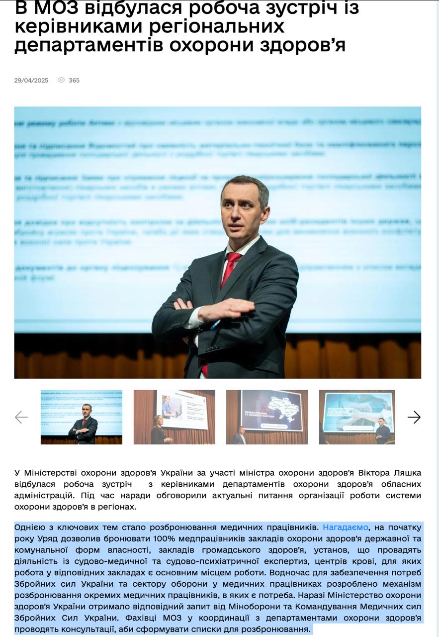 У Міністерстві охорони здоров'я України відбулася зустріч із керівниками департаментів охорони здоров'я обласних адміністрацій. Обговорювалась тема розбронювання деяких працівників медичної галузі.