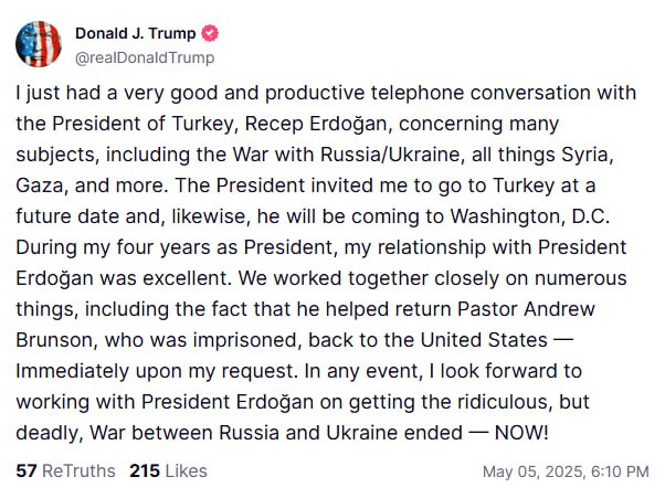 "У мене щойно відбулася дуже хороша і продуктивна телефонна розмова з президентом Туреччини Реджепом Ердоганом на багато тем, включаючи війну Росії з Україною, все, що пов'язано з Сирією, Газою і так далі... Я з нетерпінням чекаю спільної роботи з президентом Ердоганом над закінченням безглуздої, але смертоносної війни між Україною та Росією - зараз!" – написав Трамп.