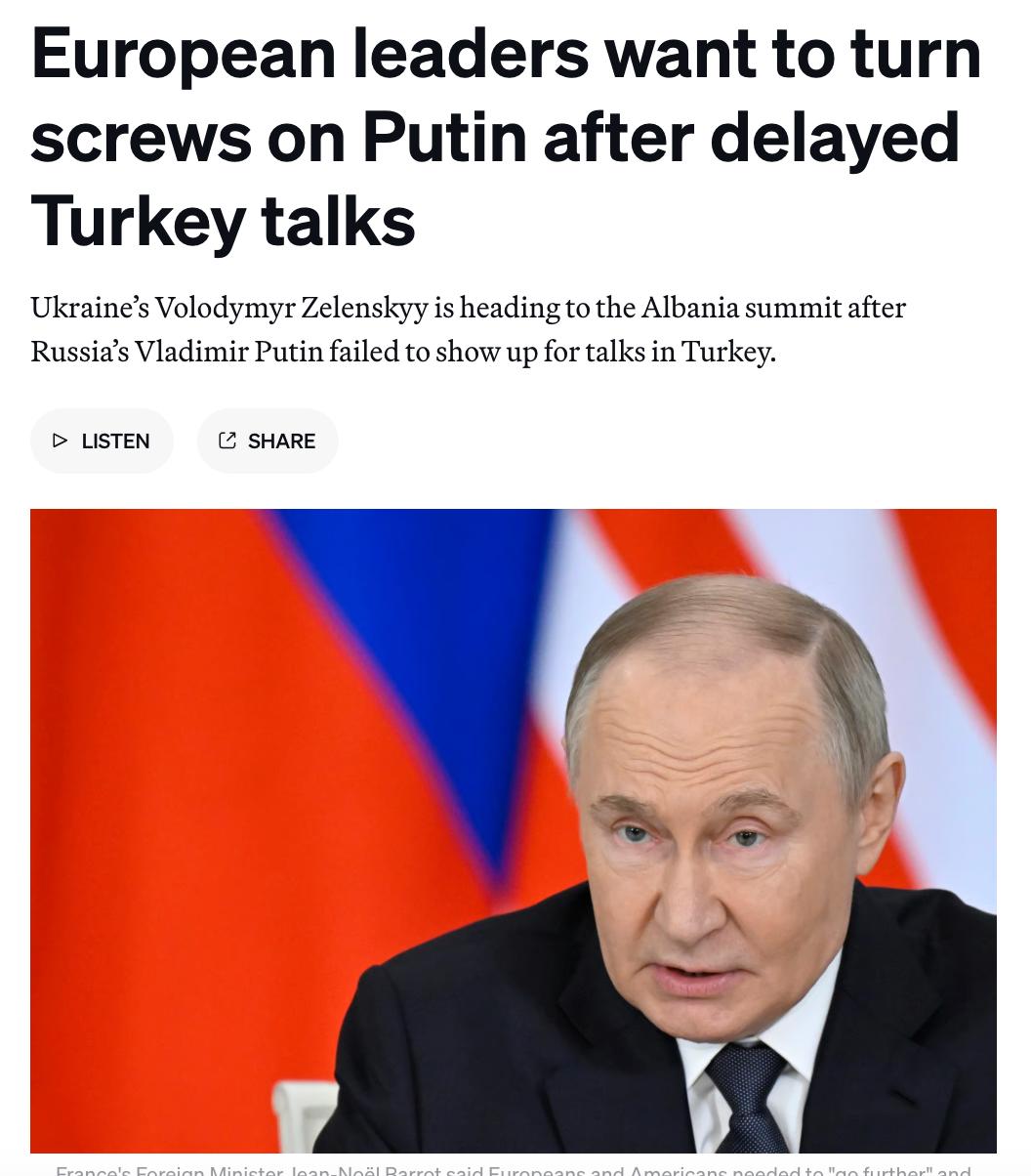 Європейські лідери готуються запровадити додаткові санкції проти Володимира Путіна після його неявки на переговори у Туреччині між Києвом та Москвою.
