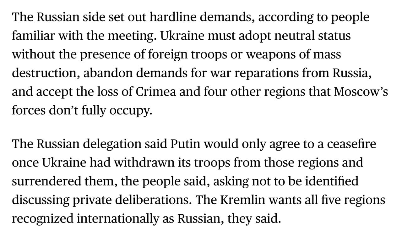 П'ять основних вимог РФ на переговорах у Стамбулі опублікувало Bloomberg