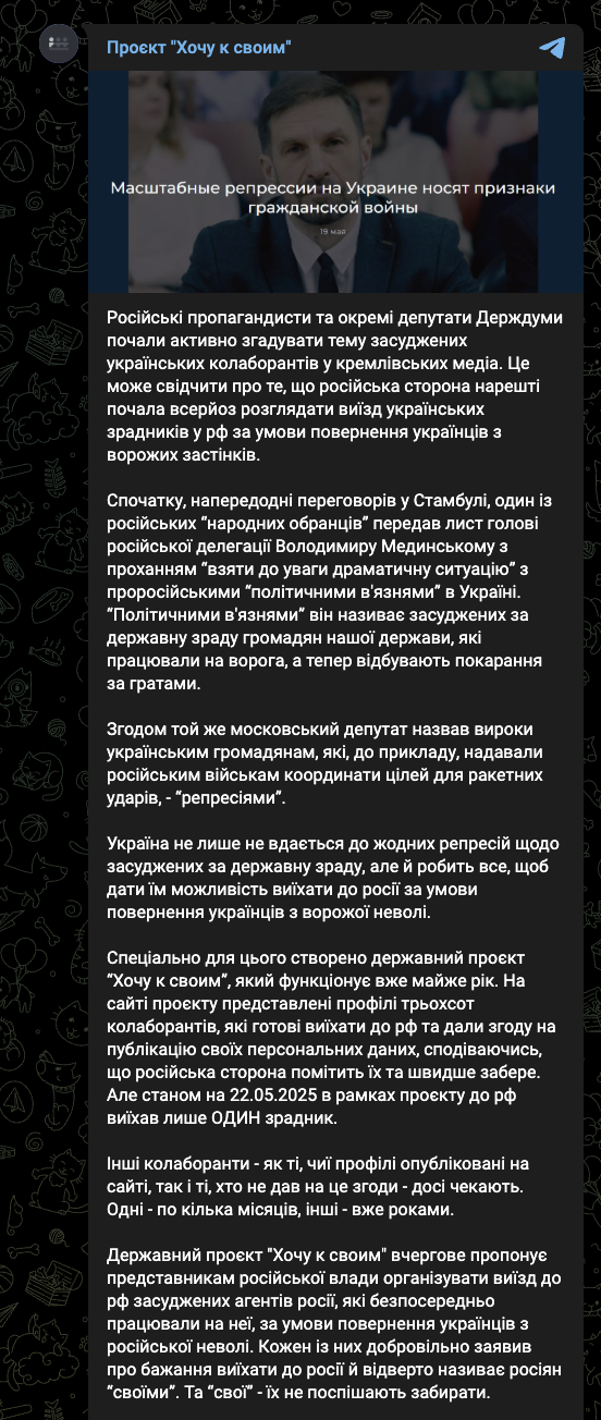 При українському Координаційному штабі з військовополонених діє проект "Хочу до своїх", де викладено дані близько трьохсот громадян України, засуджених за колабораціонізм та держзраду. Всі вони, як заявляють автори проекту, вже дали згоду на передачу в РФ з обміну - проте Москва не виявляє інтересу до того, щоб їх забирати, і на сьогодні на обмін пішов лише один українець з цього списку (що пов'язано, швидше за все з тим , що в пріоритеті для РФ повернення російських військовополонених, яких, за рядом даних).