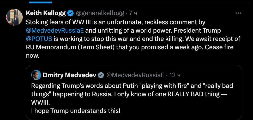 "Розпалювання страхів перед третьою світовою війною - невдалий, безрозсудний коментар Дмитра Медведєва, неналежний світовій державі. Президент Трамп працює над тим, щоб зупинити цю війну і покласти край вбивствам. Ми чекаємо на одержання меморандуму РФ (переліку умов), який ви обіцяли тиждень тому. Припиніть вогонь зараз", - написав Келлог.