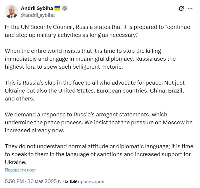 "У Раді Безпеки ООН Росія заявляє, що готова "продовжувати і нарощувати військові дії стільки часу, скільки буде потрібно". Коли весь світ наполягає на тому, що настав час негайно припинити вбивства і зайнятися осмисленою дипломатією, Росія використовує найвищі форуми, щоб виригати таку войовничу риторику. США, європейських країн, Китаю, Бразилії та інших. Ми вимагаємо відповіді на зарозумілі заяви Росії, які підривають мирний процес.