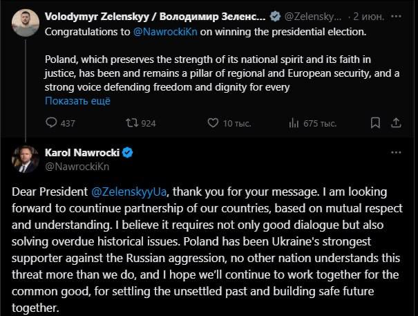 Обраний президент Польщі Кароль Навроцький відповів на привітання Володимира Зеленського з перемогою на виборах і заявив про необхідність вирішити "історичні питання, що давно назріли".
