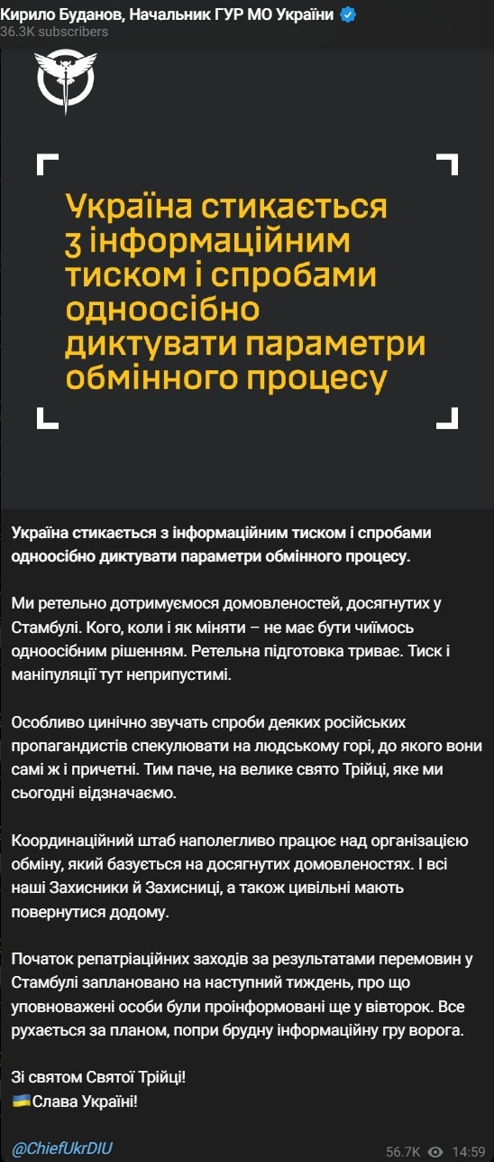 15:34 Обмін тілами загиблих між Україною та РФ планується розпочати наступного тижня, заявив голова ГУР Кирило Буданов.
